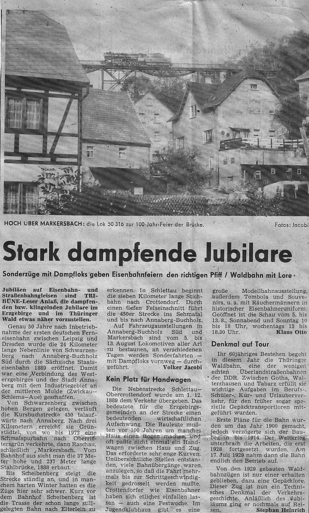 1989 wurden die Bahnstrecken Schwarzenberg - Buchholz und Schlettau - Crottendorf 100 Jahre alt. Dies sollte festlich begangen werden. Bereits 1986 fanden die ersten Verhandlungen mit dem Rat der Gemeinde Crottendorf statt. Von Seiten der Gemeinde wurden wir sehr gut unterstützt. Bei der Deutschen Reichsbahn war man eher zurückhaltend. Erst offizielle Schreiben der Gemeinde an die Rbd Dresden brachten Bewegung in die Sache.